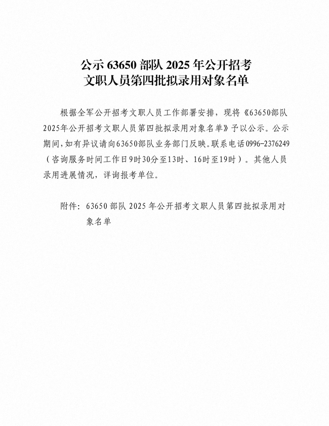 公示63650部队2025年公开招考文职人员第四批拟录用对象名单