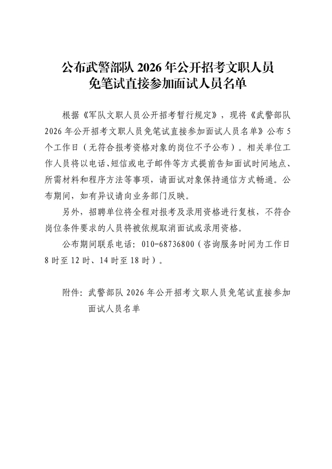 公布武警部队2026年公开招考文职人员免笔试直接参加面试人员名单