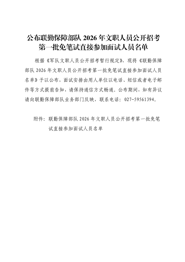 公布联勤保障部队2026年文职人员公开招考第一批免笔试直接参加面试人员名单