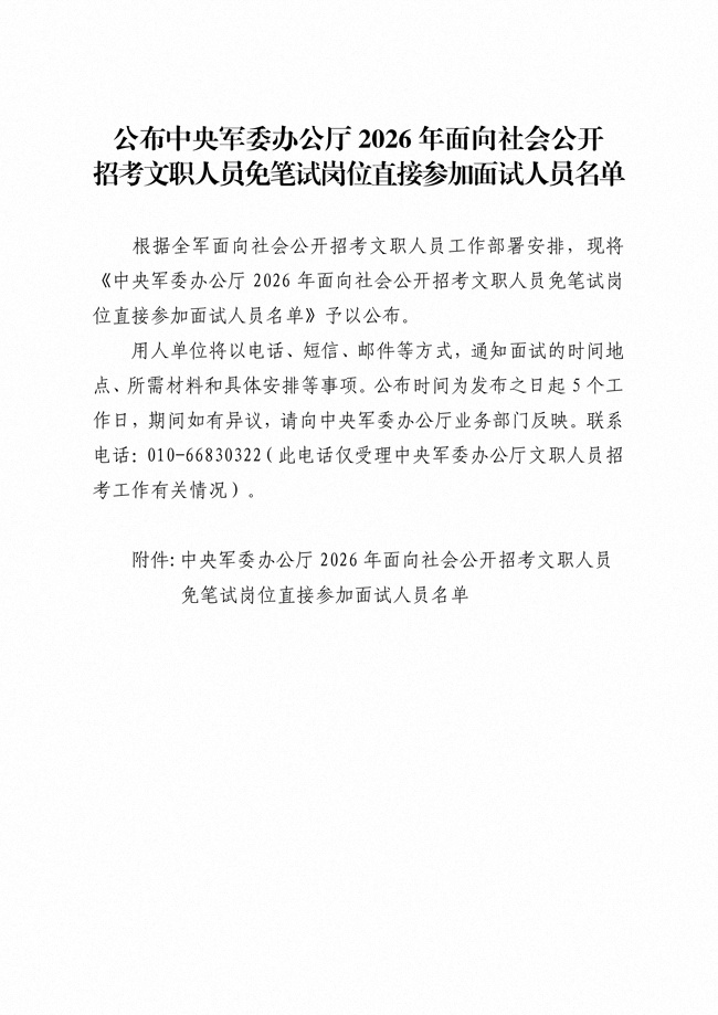 公布中央军委办公厅2026年面向社会公开招考文职人员免笔试岗位直接参加面试人员名单
