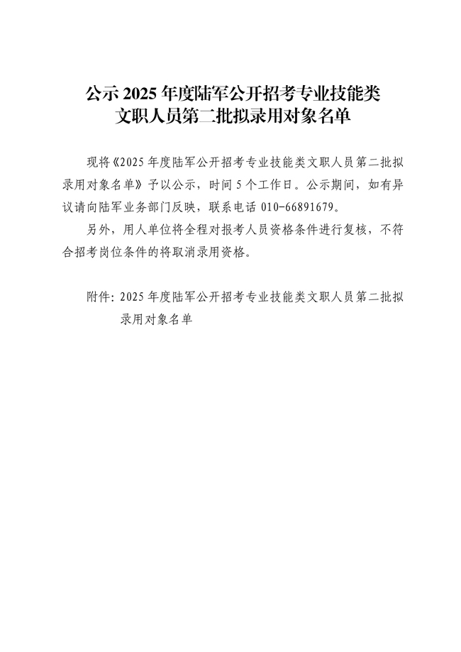公示2025年度陆军公开招考专业技能类文职人员第二批拟录用对象名单