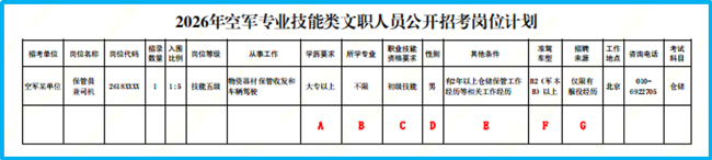 6.符合“准驾车型”要求【图中F处】。报考人员应当具有岗位要求的准驾车型以上《中华人民共和国机动车驾驶证》或《中国人民解放军车辆驾驶证》。